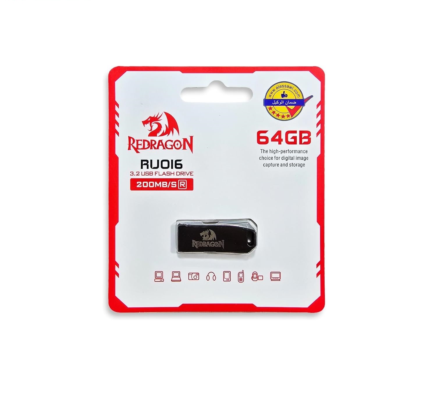 فلاشة بسعة 16 جيجابايت من Redragon، بواجهة USB 2.0، مناسبة للاستخدام البسيط وتخزين الملفات الأساسية.